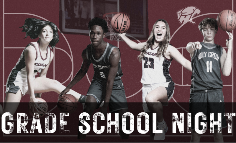 Join us for Holy Cross' Basketball Grade School Night on Friday, February 20th in the Holy Cross Gym! The boys' basketball game starts at 6:00 p.m. and the girls' at 7:30 p.m. Free admission to middle schoolers, giveaways, and more!